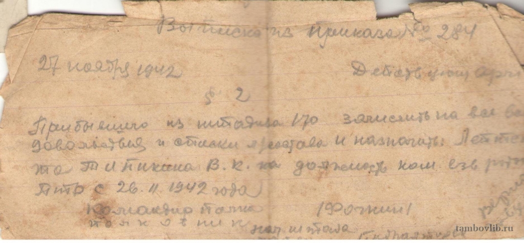 Выписка из приказа №284 27 ноября 1942 года о назначении лейтенанта Типикина В.К. на должность ком… роты. Действующая армия.Межпоселенческая библиотека Рассказовского района Документ