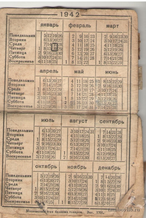 Календарь из военной записной книжки Типикина Виктора Константиновича.