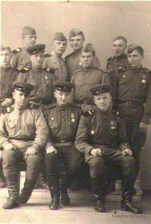 Родился 19 октября 1912 г. в Тамбовской области, Волчковский район, д.Любовка. Призван в армию 25.11.1941 г. Мичуринским РВК. Прошел всю войну от Москвы до Берлина, ни разу не получив ранения, ефрейтор, сержант (командир отделения связи отдельной батареи Командующего артиллерией 62 стрелкового Неманского корпуса). Принимал участие в боях при прорыве обороны противника южнее Варшавы, за освобождение г.Калиш (Польша), при овладении г.Тумашув (Польша), в прорыве обороны противника на р.Висла, при форсировании р.Неман, при завоевании плацдарма на р.Одер, при вторжении в пределы Бранденбургской провинции Германии, по окружению и ликвидации группы немецких войск юго-восточнее Берлина, при прорыве обороны немцев и наступления на Берлин. Награжден двумя орденами Красной Звезды, медалями «За отвагу», «За боевые заслуги», «За оборону Москвы», «За освобождение Варшавы», «За взятие Берлина», юбилейными медалями, отмечен 8 благодарностями от И.Сталина. После войны работал в локомотивном депо станции Кочетовка г.Мичуринска. Умер 10 октября 1991 г. На фото второй ряд второй слева.Добавлена 13 Мая 2015