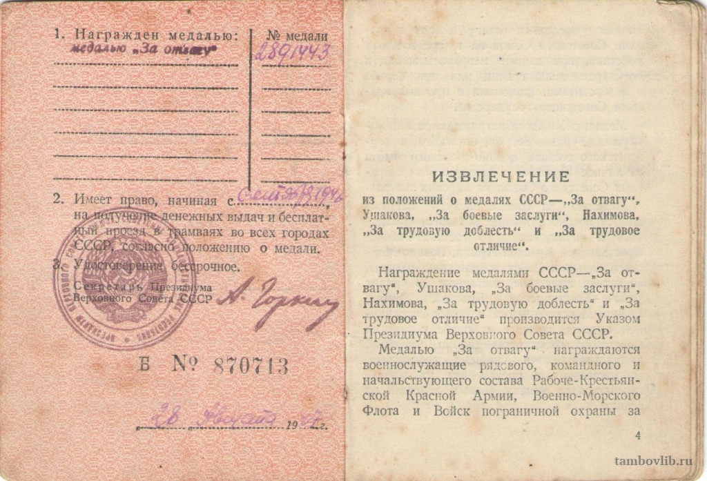 Удостоверение к медали «За отвагу» Типикину Виктору Константиновичу.Межпоселенческая библиотека Рассказовского района Документ