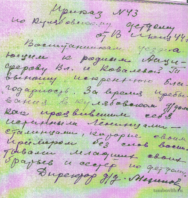 У некоторых детей находились родные, которые готовы были забрать к себе детей из детдома. Приказ по Кулябовскому детдому от 13 июля 1944 года № 43 "Воспитанникам уезжающим к родным... выношу искреннюю благодарность. За время пребывания в Кулябовском детдоме как проявившим себя истинными Ленинцами-сталинцами, которые своим примером... воспитывали младших братьев и сестер по детдому." основание:ф.69,оп.3,д.1,л.50. Материал архивного отдела администрации Мучкапского района.Центральная библиотека Мучкапского района Документ