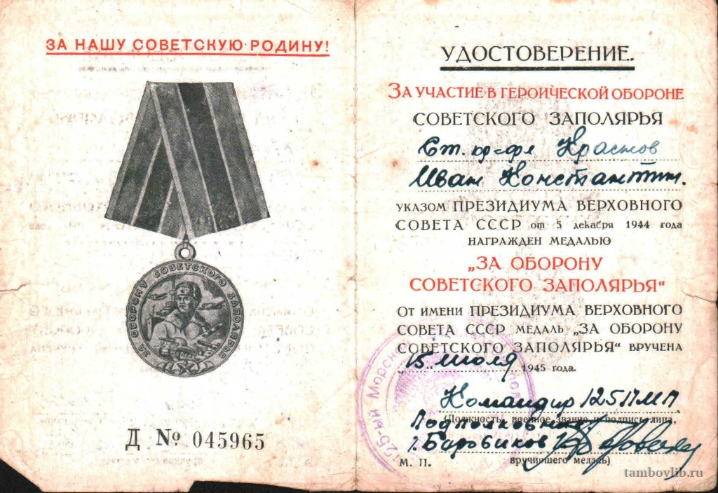 Удостоверение к медали "За оборону Советского Заполярья" Краснова Ивана Константиновича
