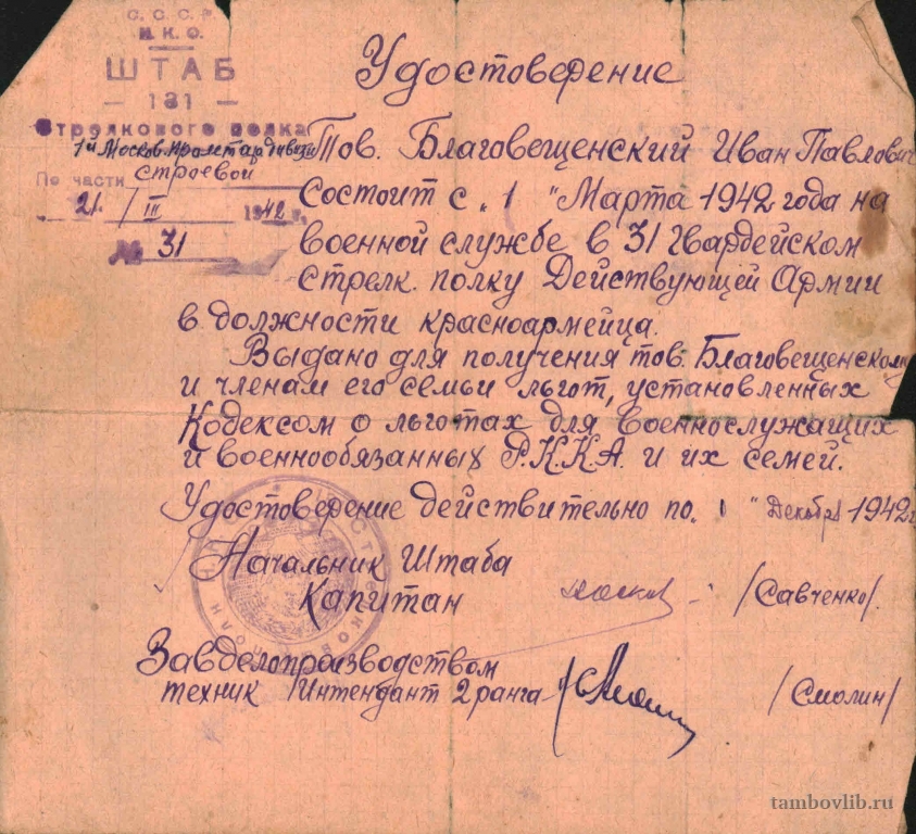Удостоверение Благовещенского Ивана Павловича