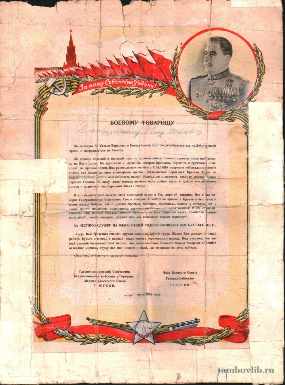 Родился 4 февраля 1901 г. в г. Тамбове. Окончил 7 классов и до войны работал электромонтёром. В ряды Красной Армии был призван в 1942 г. Тамбовским РВК. Служил в должности стрелка 5-ой стрелковой роты 73 стрелкового полка 33 стрелковой Холмско-Берлинской Краснознамённой ордена Суворова дивизии с 1942 по 1945 г. 28 апреля 1945 г. при выполнении задачи по обеспечению боеприпасами передовой линии в уличных боях г. Берлина проявил себя мужественным защитником, был легко ранен. Представлен к награждению медалью «За отвагу». Награждён медалями «За взятие Берлина», «За Победу над Германией в ВОВ 1941-1945 гг.» и юбилейными медалями. После войны работал истопником в кинотеатре «Родина». Умер в 1984 г.Добавлена 16 Мая 2015