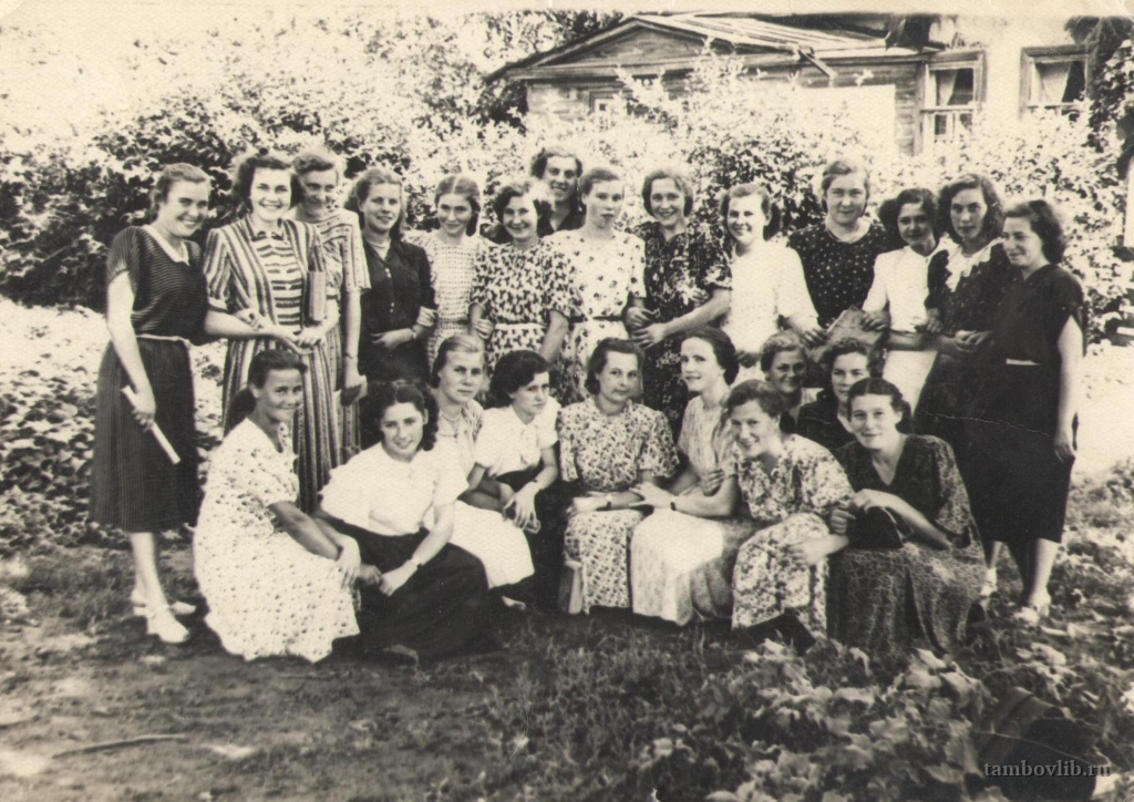 Ларина Нина Ивановна (третья слева в 1 ряду) - жительница р. п. Инжавино. Ветеран труда. Родилась в 1935 году в с. Ломовка Инжавинского района. Ее детство пришлось на тяжелые военные годы. Отец погиб на фронте. После окончания школы поступила в Тамбовскую фельдшерско-акушерскую школу. Работала медицинской сестрой в Инжавинской районной больнице, в санатории "Инжавинский". Фотография сделана во время учебы в фельдшерско-акушерской школе.Межпоселенческая центральная библиотека Инжавинского района Портрет
