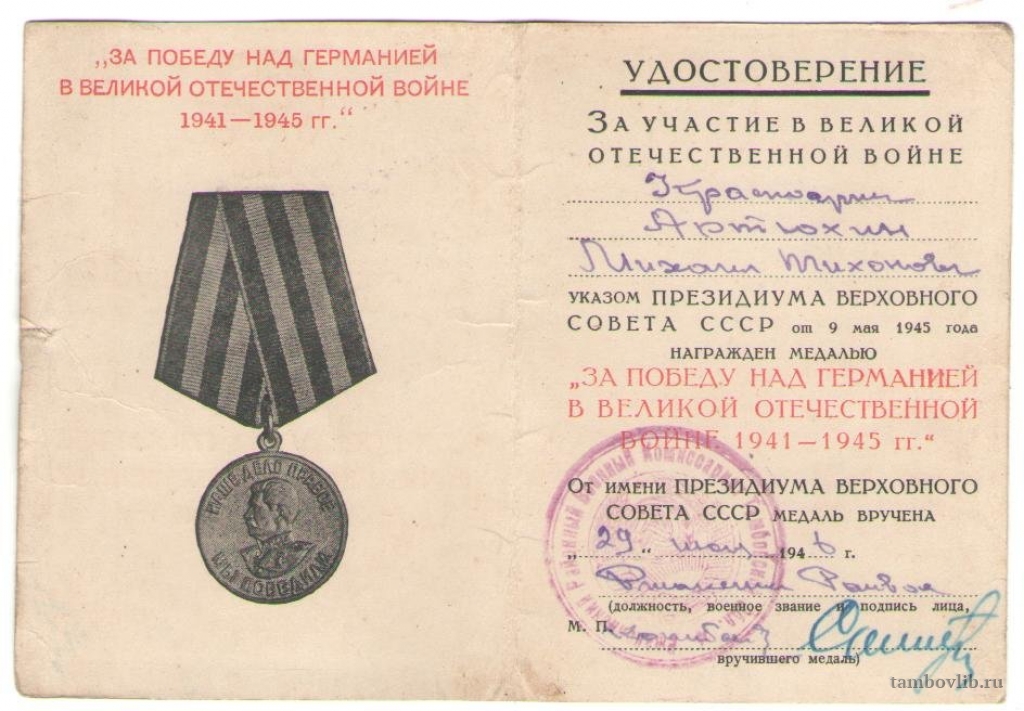 Удостоверение к медали "ЗА ПОБЕДУ НАД ГЕРМАНИЕЙ В ВЕЛИКОЙ ОТЕЧЕСТВЕННОЙ ВОЙНЕ 1941-1945 гг.", выданное Артюхину Михаилу Тихоновичу в 1948 году.
