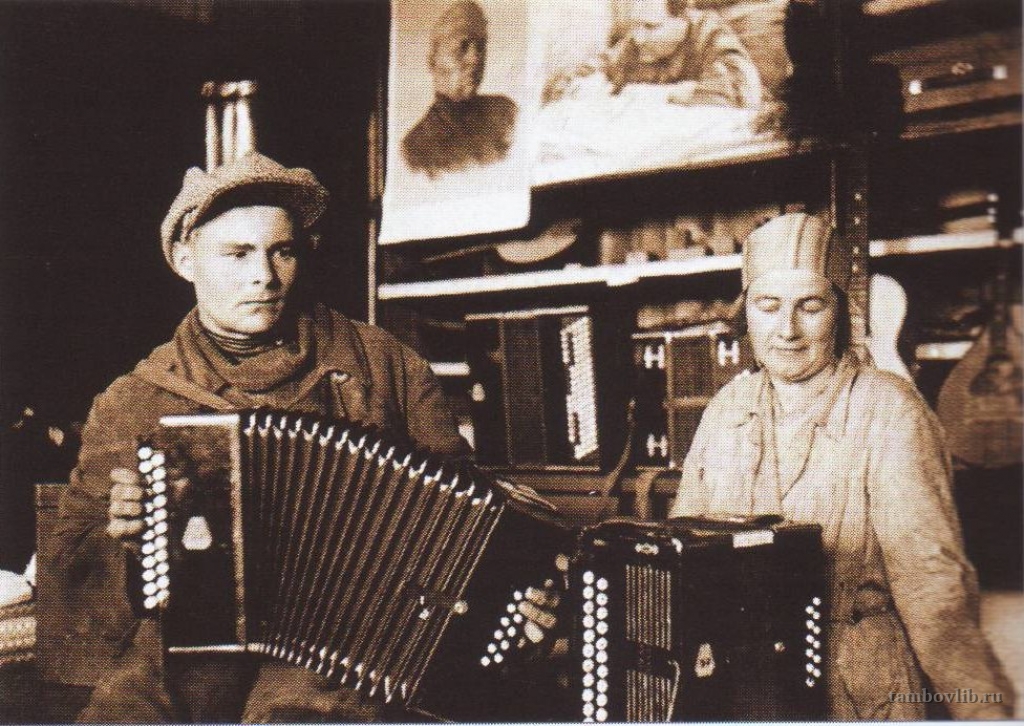 Демобилизованный солдат А. Д. Болдин выбирает гармонь в магазине.