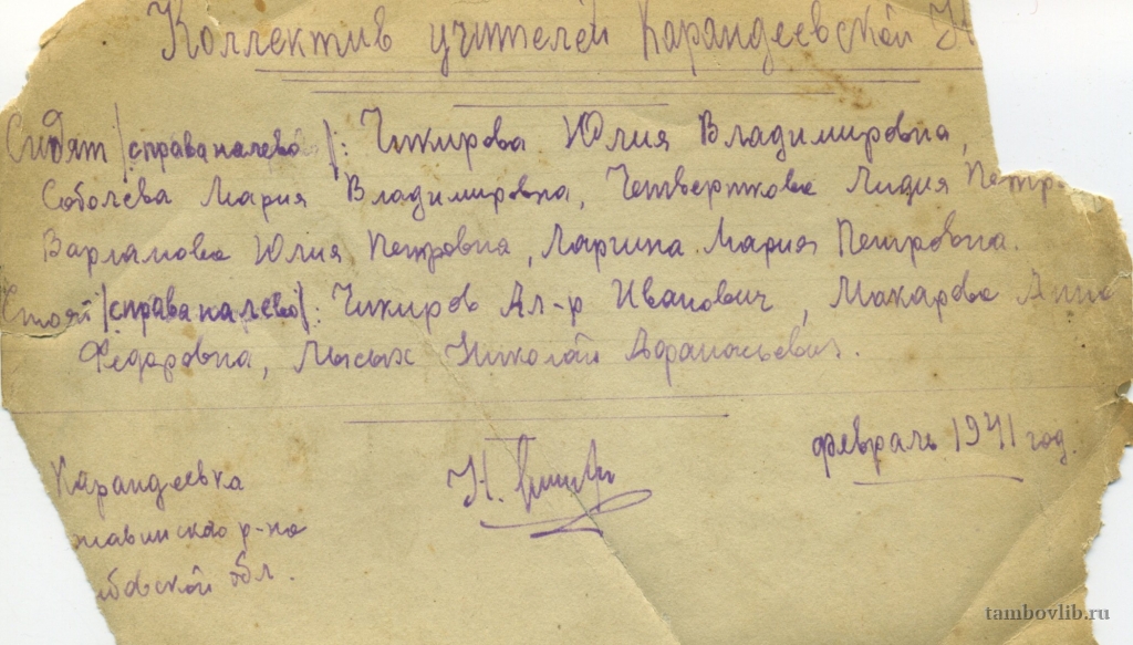 Оборот фотографии учителей Карандеевской школы Инжавинского района. Из архива Бакураевой (Голубева) Людмилы Евгеньевны.