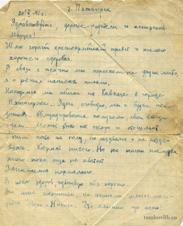 1 страница письма из г. Пятигорска. Из архива Бакураевой (Голубева) Людмилы Евгеньевны.