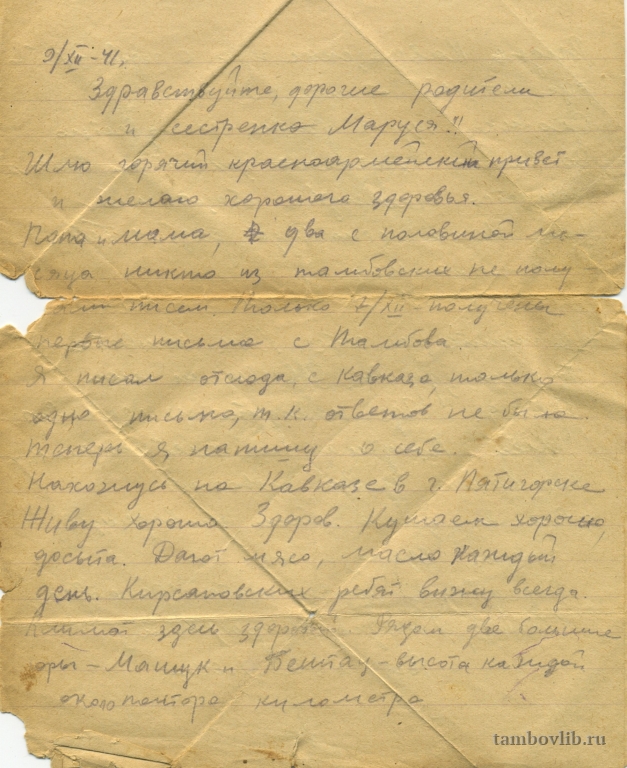 Второе письмо с фронта, 1 страница. Из архива Бакураевой (Голубева) Людмилы Евгеньевны.