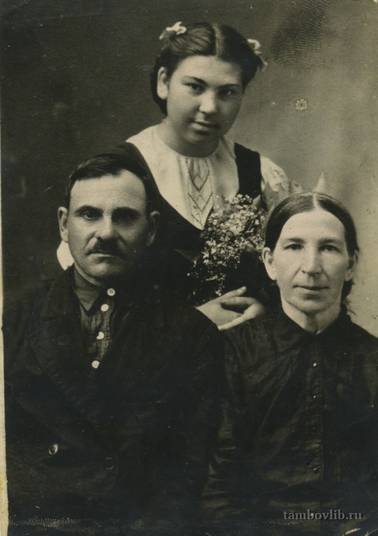 Уроженцы с. Калаис Кирсановского района Тамбовской области. Труженики тыла. Афанасий Григорьевич - участник первой мировой войны. Потом стал председателем колхоза «Пчелка», выучился на ветеринарного врача и работал многие годы. После выхода на пенсию до 75 лет трудился в колхозе. Имел награды «За доблестный труд» в ознаменование 100-летия со дня рождения Владимира Ильича Ленина. Евдокия Дмитриевна была грамотной. Женщина удивительной доброты и терпения, была чуткой ко всем людям, бескорыстна. Всю жизнь трудилась в колхозе. В годы войны отдали одну свою комнату эвакуированным людям. Афанасий Григорьевич и Евдокия Дмитриевна участвовали в добровольном сборе средств для танковой колонны «Тамбовский колхозник». На фото с дочерью Марией.Добавлена 4 Июня 2015