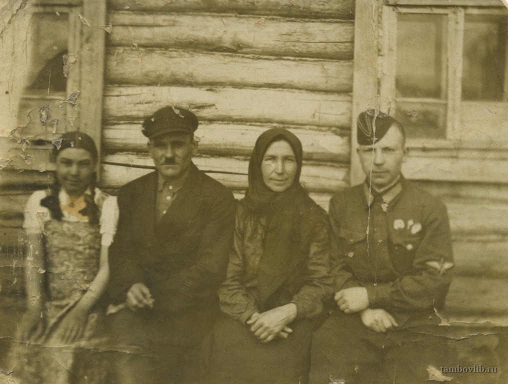 Лысых Афанасий Григорьевич (01.05.1893 - 28.04.1974) и Лысых Евдокия Дмитриевна (1889 - 02.11.1968) Уроженцы с. Калаис Кирсановского района Тамбовской области. Труженики тыла. Афанасий Григорьевич - участник первой мировой войны. Потом стал председателем колхоза «Пчелка», выучился на ветеринарного врача и работал многие годы. После выхода на пенсию до 75 лет трудился в колхозе. Имел награды «За доблестный труд» в ознаменование 100-летия со дня рождения Владимира Ильича Ленина. Евдокия Дмитриевна была грамотной. Женщина удивительной доброты и терпения, была чуткой ко всем людям, бескорыстна. Всю жизнь трудилась в колхозе. В годы войны отдали одну свою комнату эвакуированным людям. Афанасий Григорьевич и Евдокия Дмитриевна участвовали в добровольном сборе средств для танковой колонны «Тамбовский колхозник». На фото с дочерью Марией и сыном Александром.Добавлена 4 Июня 2015
