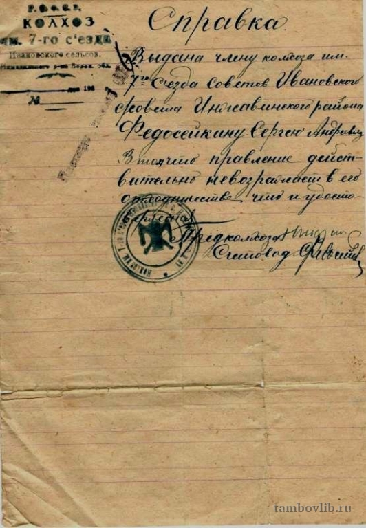 Справка выдана правлением колхоза имени 7 съезда СоветовМежпоселенческая центральная библиотека Инжавинского района Документ