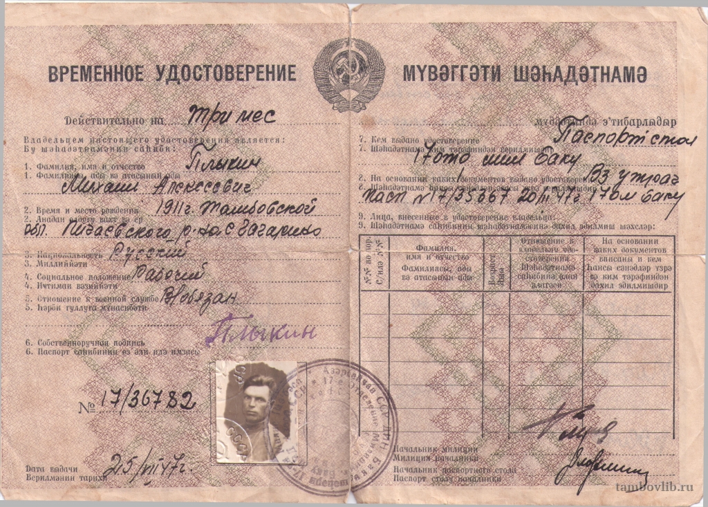 Плыкин Михаил Алексеевич, участник Великой Отечественной войны.25 июля 1947 Межпоселенческая центральная библиотека Пичаевского района Документ