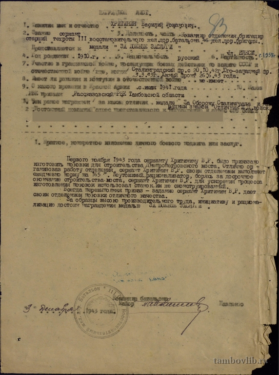 Хритинина Василия Романовича, участника Сталинградской битвы1943 Межпоселенческая центральная библиотека Пичаевского района Документ