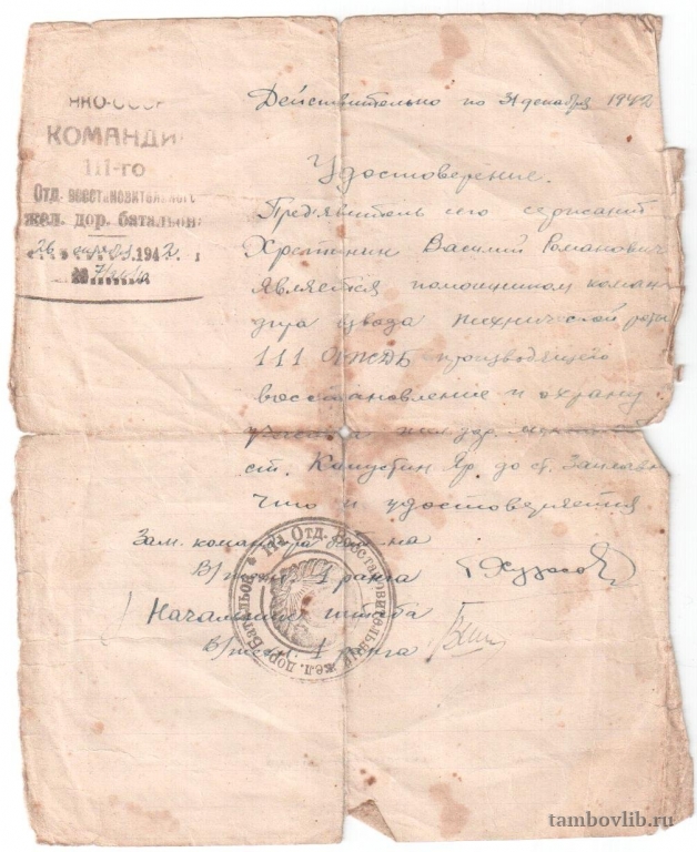 Удостоверение Хритинина Василия Романовича, в том, что он является помощником командира взвода.