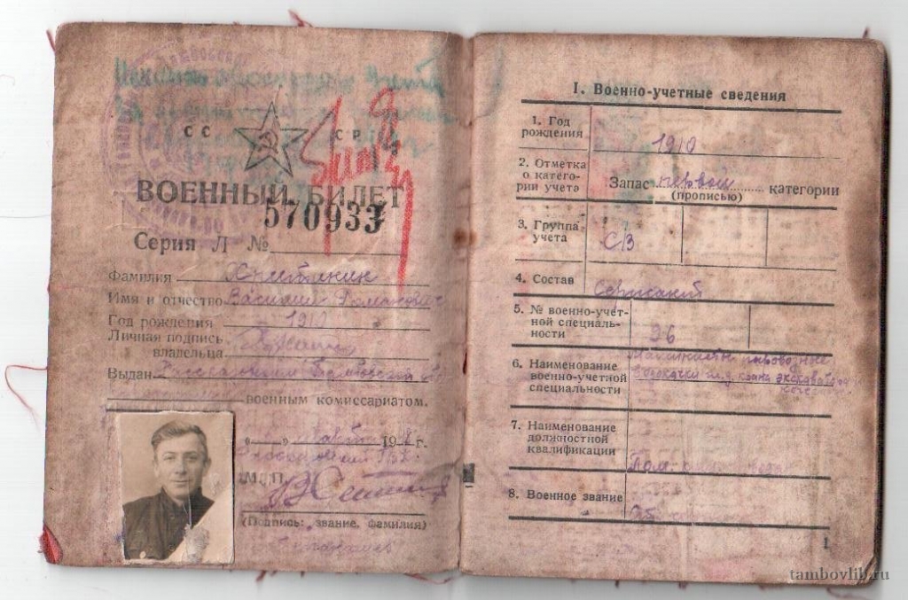 Хритинин Василий Романович(1910 - 1982), участник Великой Отечественной войны.Межпоселенческая центральная библиотека Пичаевского района Документ