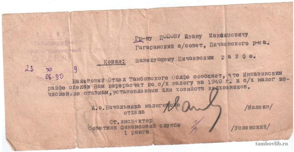Из семейного архива жителей пос. Октябрьский1949 Межпоселенческая центральная библиотека Пичаевского района Документ