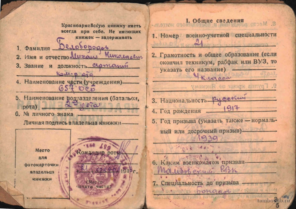Родился 18 декабря 1917 г. в с. Покрово-Пригородное (с. Щемиловка) Тамбовского района Тамбовской области. Окончив 4 класса пошел учится на бондаря. 17 марта 1939 г. был направлен в Красную Армию. Служба проходила на озере Хасан. В 1941 г. из в/ч 6476 2 роты, в звании ефрейтор-сапер, направлен в 929 ОКСБ, в 1-ую саперную роту. В 1943 г. направлен под г. Могилев в Белоруссии в 657 отдельный саперный батальон. Часто под артиллерийским, автоматным огнем нужно было очищать подходы к реке при форсировании водных преград. В апреле 1945 г. при форсировании р. Одер (был командиром взвода саперного батальона) при выполнении боевой задачи был ранен. Был направлен в госпиталь, находящийся в Германии. Сражался до конца войны и победу встретил в Германии. Демобилизовался в мае 1946 г., вернулся в Тамбов и продолжил службу в органах внутренних дел по 1971 г. Был награжден орденом «Отечественной войны II степени», орденом «Славы II степени», орденом «Славы III степени», орденом «Красной Звезды», медалью «За боевые заслуги», нагрудным знаком «Отличник милиции», юбилейным орденом «Отечественной войны I степени», юбилейными медалями. Умер 9.07.2007 г. На фото Красноармейская книжка.