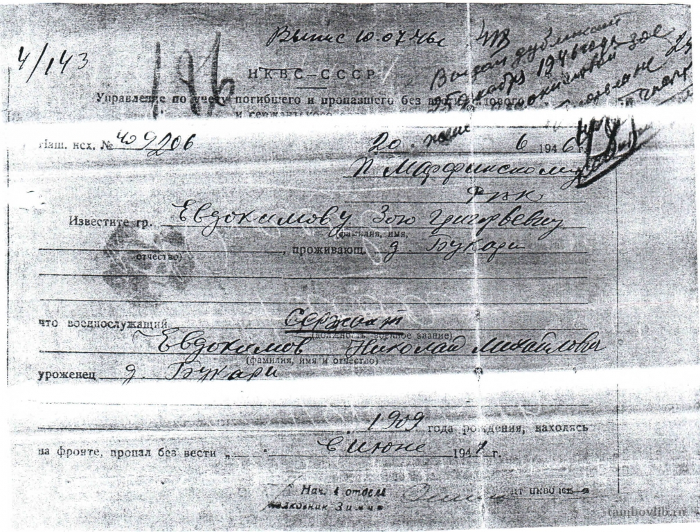 Родился в 1909 г. в д. Букари Покрово-Марфинского района Тамбовской области. Был призван в ряды Красной Армии в 1941 г. в звании сержанта. Пропал без вести в 1941 г.
