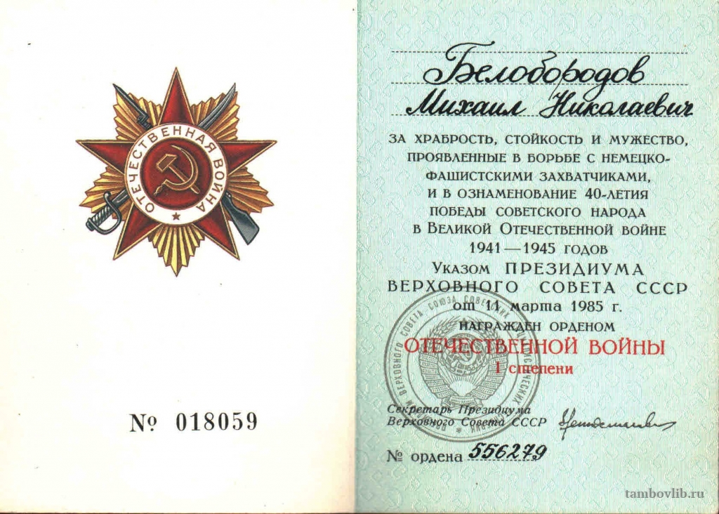 Родился 18 декабря 1917 г. в с. Покрово-Пригородное (с. Щемиловка) Тамбовского района Тамбовской области. Окончив 4 класса пошел учится на бондаря. 17 марта 1939 г. был направлен в Красную Армию. Служба проходила на озере Хасан. В 1941 г. из в/ч 6476 2 роты, в звании ефрейтор-сапер, направлен в 929 ОКСБ, в 1-ую саперную роту. В 1943 г. направлен под г. Могилев в Белоруссии в 657 отдельный саперный батальон. Часто под артиллерийским, автоматным огнем нужно было очищать подходы к реке при форсировании водных преград. В апреле 1945 г. при форсировании р. Одер (был командиром взвода саперного батальона) при выполнении боевой задачи был ранен. Был направлен в госпиталь, находящийся в Германии. Сражался до конца войны и победу встретил в Германии. Демобилизовался в мае 1946 г., вернулся в Тамбов и продолжил службу в органах внутренних дел по 1971 г. Был награжден орденом «Отечественной войны II степени», орденом «Славы II степени», орденом «Славы III степени», орденом «Красной Звезды», медалью «За боевые заслуги», нагрудным знаком «Отличник милиции», юбилейным орденом «Отечественной войны I степени», юбилейными медалями. Умер 9.07.2007 г.Добавлена 27 Апреля 2016