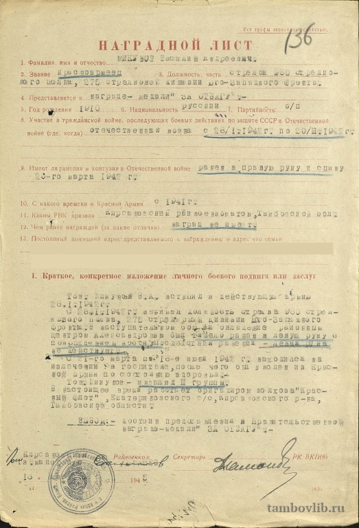 Наградной лист красногвардейца Микунова Василия Андреевича, 1910 г.р. На войне с 28.01.1942 по 20.03.1942. В марте 1942 г. был ранен в руку и спину, находился на лечении в госпитале, после чего уволен из рядов Красной Армии по состоянию здоровья. Получив инвалидность III гр., работал бригадиром колхоза "Красный флот" Екатериниского с/с Кирсановского р-на Тамбовской обл.16 декабря 1945 Кирсановская городская библиотека Документ Кирсанов, Тамбовская обл., Россия
