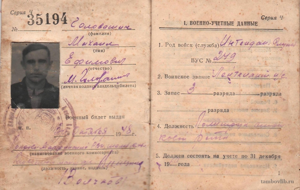 Военный билет Головашина Михаила Ефимовича