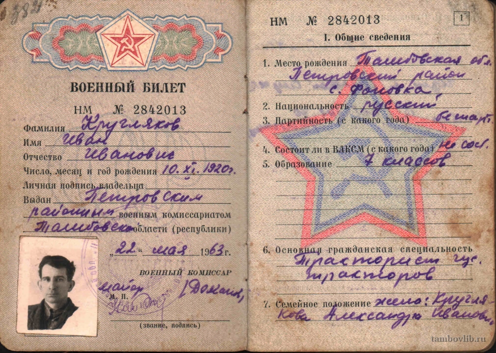 Военный билет Круглякова Ивана Ивановича, рядового