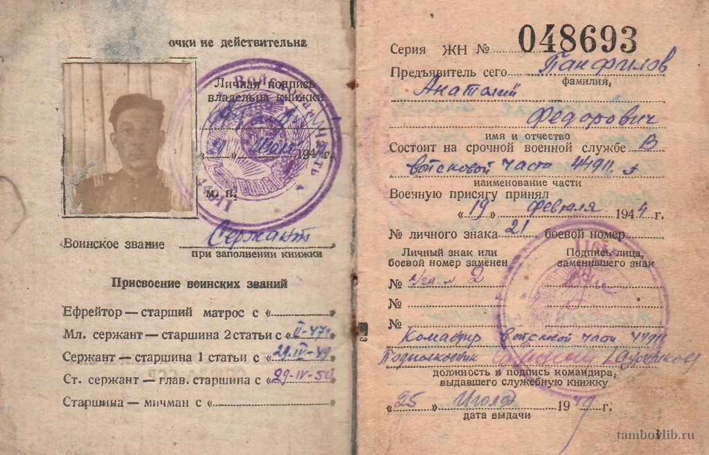 Служебная книжка военнослужащего срочной службы Вооруженных сил СССР Панфилова Анатолия Федоровича