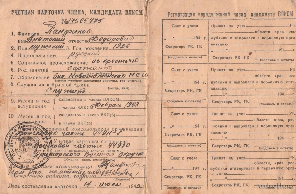 Учетная карточка члена ВЛКСМ Панфилова Анатолия Федоровича