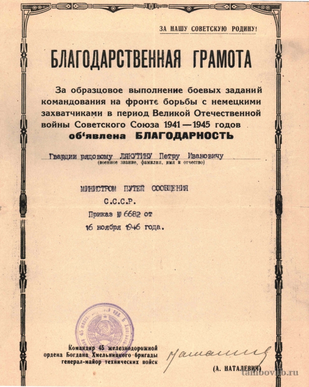 Родился 29 июня 1924 г. в с. Незнановка Тамбовского района Тамбовской области. Призван на действительную военную службу 18 августа 1942 г. Тамбовским райвоенкоматом. С августа 1942 г. по февраль 1943 г. проходил службу курсантом 90 запасного зенитно-артиллерийского полка, который входил в состав 125 отдельной стрелковой бригады. С августа 1942 г. бригада находилась в резерве 33-й Армии. В феврале 1943 г. был зачислен стрелком 97 гвардейского Краснознаменного полка (командир полка полковник А. А. Булахов, заместитель командира полка по политчасти майор Е. Ф. Семенов), входившего в состав 31 гвардейской стрелковой Витебской Краснознаменной орденов Ленина и Суворова дивизии. В феврале 1943 г. дивизия в составе 16-й Армии Западного фронта наступает на орловском направлении. В ходе контрнаступления советских войск в Курской битве дивизия действовала в составе 11-й гвардейской армии Западного, с 1 августа – Брянского фронтов, участвует в освобождении г. Карачев (15.08.1943). Командир (февраль 1943-июль 1944): полковник, с 17.11.1943 – генерал-майор И.К. Щербина. 3 марта 1943 г. получил ранение. В ноябре 1943 г. зачислен плотником-мостовиком 104-го восстановительного железнодорожного батальона, который входил в состав 45-й железнодорожной ордена Богдана Хмельницкого бригады (командир- полковник А. И. Наталевич). 28 декабря 1944 г. за самоотверженную работу по восстановлению и эксплуатации прифронтовых железных дорог награжден Почетной грамотой ЦК ВЛКСМ. Приказом №6682 от 16 ноября 1946 г. Министром путей сообщения СССР за образцовое выполнение боевых заданий командования на фронте борьбы с немецкими захватчиками в период Великой Отечественной войны Советского Союза 1941-1945 годов объявлена благодарность. Награжден медалями «За боевые заслуги», «За Победу над Германией Великой Отечественной войне 1941-1945 гг.», юбилейным орденом «Отечественной войны I степени» и юбилейными медалями. Победу встретил в Германии. Велись восстановительные работы в Дрездене. С декабря 1946 г. проходил службу в 9 отдельном железнодорожном батальоне командиром отделения мостовиков-монтажников. Уволен в запас 17 апреля 1950 г.Добавлена 26 Мая 2016