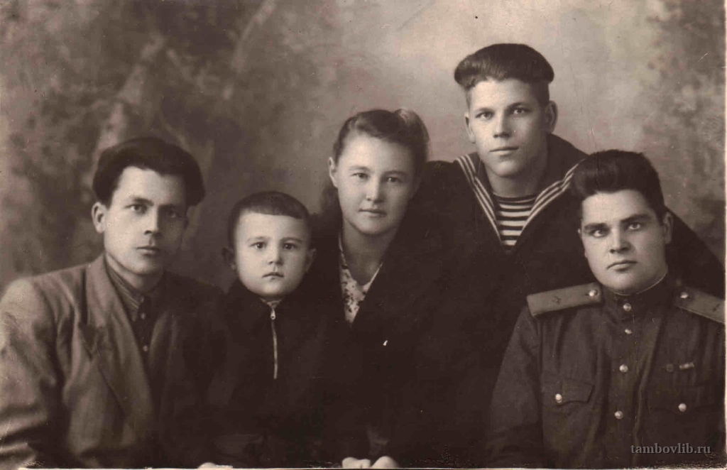 Родился 29 июня 1924 г. в с. Незнановка Тамбовского района Тамбовской области. Призван на действительную военную службу 18 августа 1942 г. Тамбовским райвоенкоматом. С августа 1942 г. по февраль 1943 г. проходил службу курсантом 90 запасного зенитно-артиллерийского полка, который входил в состав 125 отдельной стрелковой бригады. С августа 1942 г. бригада находилась в резерве 33-й Армии. В феврале 1943 г. был зачислен стрелком 97 гвардейского Краснознаменного полка (командир полка полковник А. А. Булахов, заместитель командира полка по политчасти майор Е. Ф. Семенов), входившего в состав 31 гвардейской стрелковой Витебской Краснознаменной орденов Ленина и Суворова дивизии. В феврале 1943 г. дивизия в составе 16-й Армии Западного фронта наступает на орловском направлении. В ходе контрнаступления советских войск в Курской битве дивизия действовала в составе 11-й гвардейской армии Западного, с 1 августа – Брянского фронтов, участвует в освобождении г. Карачев (15.08.1943). Командир (февраль 1943-июль 1944): полковник, с 17.11.1943 – генерал-майор И.К. Щербина. 3 марта 1943 г. получил ранение. В ноябре 1943 г. зачислен плотником-мостовиком 104-го восстановительного железнодорожного батальона, который входил в состав 45-й железнодорожной ордена Богдана Хмельницкого бригады (командир- полковник А. И. Наталевич). 28 декабря 1944 г. за самоотверженную работу по восстановлению и эксплуатации прифронтовых железных дорог награжден Почетной грамотой ЦК ВЛКСМ. Приказом №6682 от 16 ноября 1946 г. Министром путей сообщения СССР за образцовое выполнение боевых заданий командования на фронте борьбы с немецкими захватчиками в период Великой Отечественной войны Советского Союза 1941-1945 годов объявлена благодарность. Награжден медалями «За боевые заслуги», «За Победу над Германией Великой Отечественной войне 1941-1945 гг.», юбилейным орденом «Отечественной войны I степени» и юбилейными медалями. Победу встретил в Германии. Велись восстановительные работы в Дрездене. С декабря 1946 г. проходил службу в 9 отдельном железнодорожном батальоне командиром отделения мостовиков-монтажников. Уволен в запас 17 апреля 1950 г. На фото слева, с женой Валентиной, сыном Виктором и братьями Семеном и Василием.Добавлена 26 Мая 2016