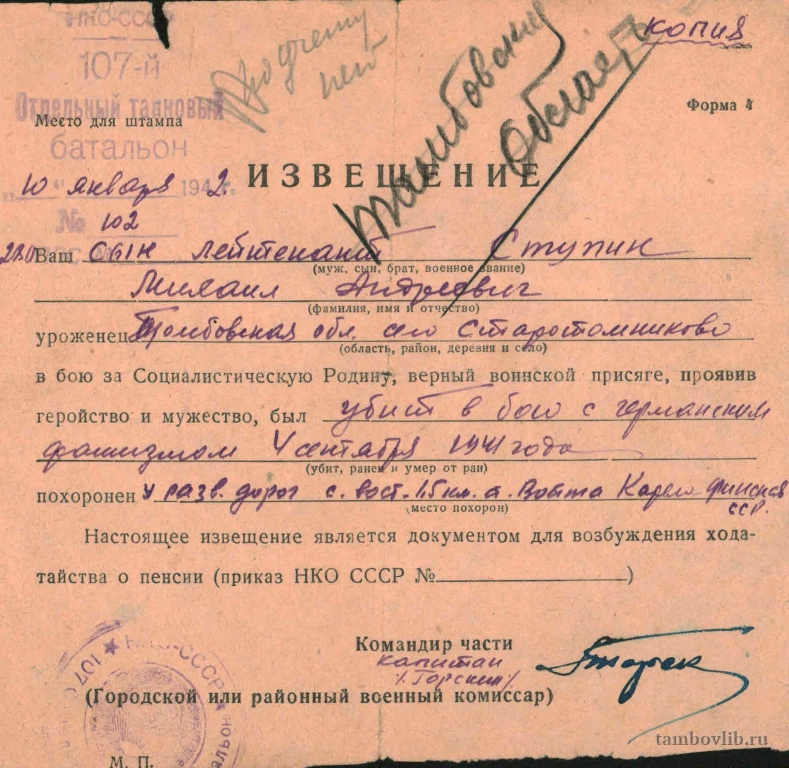 Родился в 1919 г. в с. Старотомниково бывшего Шацкого уезда Тамбовской губернии в семье крестьянина-середняка. В июне 1941 г. закончил Краснознаменное Ульяновское училище им. В. И. Ленина. Присвоено звание лейтенант. Кандидат в члены ВКП(б). С первых дней войны - командир танкового взвода 42 СК 107 отдельного танкового батальона. Убит в бою 04.09.1941 г. на западных скатах горы Войта, у развилки дорог. Похоронен: Карело-Финская ССР, Кестельгский район, гора Войта, западные скаты, 1,5 км у развилки дорог. Перезахоронен на войсковом кладбище - Мурманская область, Кандалакинский район, 102 км Кандалакта-Алакуртти, ст. Войта, номер захоронения 556. Награжден юбилейным орденом «Отечественной войны I сетепени». Отец, Ступин Андрей Кириллович, имел профессию столяра. Мать, Ступина Варвара Ивановна, домохозяйка. На фото извещение.Добавлена 16 Июня 2016
