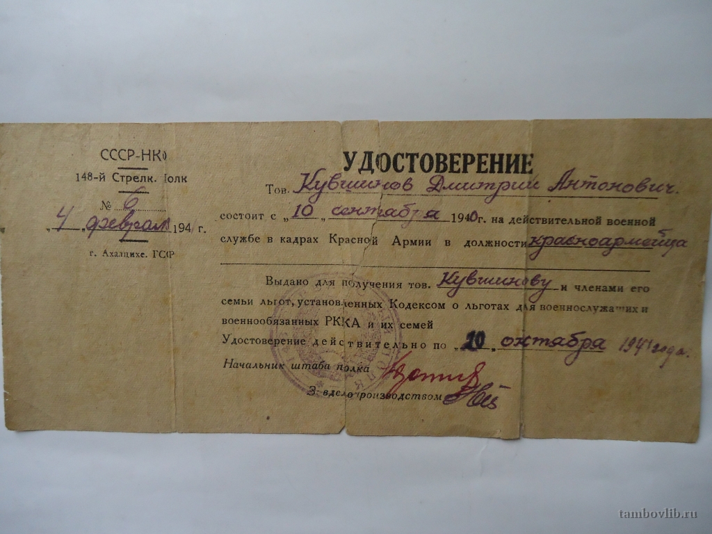 Кувшинов Дмитрий Антонович. Удостоверение о службе в кадрах Красной Армии в звании красноармейца.