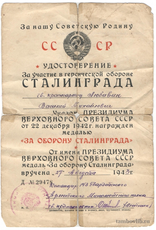 Удостоверение. За участие в героической обороне Сталинграда гв. красноармеец Любавин Василий Михайлович награжден медалью "За оборону Сталинграда" (указ Президиума Верховного Совета СССР от 22 декабря 1943 года)