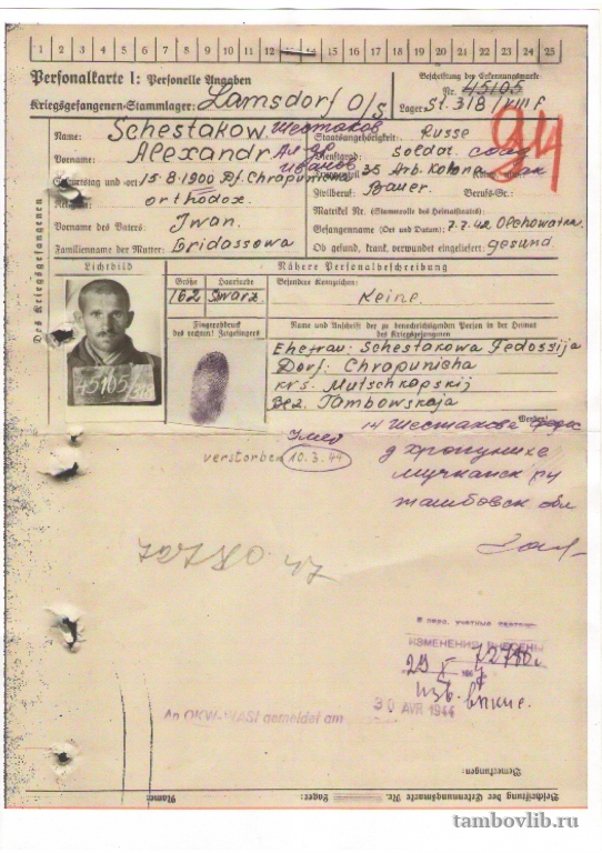 Шестаков Александр Иванович, 15.08.1900 г.р. Проживал в д. Хропунихе Мучкапского района Тамбовской области с женой Шестаковой Федосией. Солдат Советской армии.7.07.1942 г. был заключен в лагерь Ламсдорф и умер там 10.03.1944г.Центральная библиотека Мучкапского района Документ