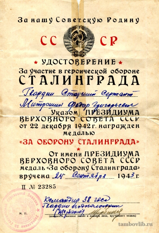 Гвардии старший сержант Митрошин Федор Григорьевич награжден медалью "За оборону Сталинграда"24 сентября 1943 Межпоселенческая центральная библиотека Моршанского района Документ
