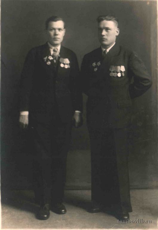 Родился 22.06.1911 г. в д. Ильиновка Сосновского (Ламского) района Тамбовской области. Был призван в ряды Красной Армии Ламским РВК Сосновского района Тамбовской области сразу после начала войны. Воевал на 1-ом Украинском фронте Киевского направления, на 2-ом Украинском фронте 180 стрелковой дивизии. Войну закончил в звании лейтенанта. Участвовал в освобождении Китая от японских захватчиков. Демобилизовался из Армии в июле 1946 г. Был награжден орденом «Отечественной войны» II степени, орденом «Красной Звезды», медалями «За взятие Вены», «За взятие Будапешта», «За освобождение Праги», «За Победу над Германией в Великой Отечественной войне 1941-1945 гг.», «За Победу над Японией». После войны работал учителем в Нижне-Ярославской школе Сосновского района Тамбовской области, Первомайской школе № 2 Тамбовской области, Староклёнской школе Тамбовской области. Умер 21.03.1974 г. На фото слева.Добавлена 16 Мая 2019