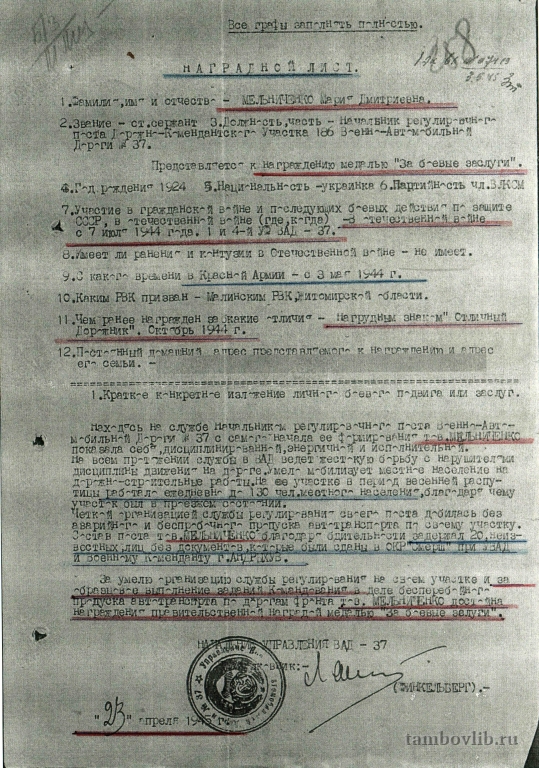 Наградной лист Савельевой (Мельниченко) Марии Дмитриевны, старшего сержанта