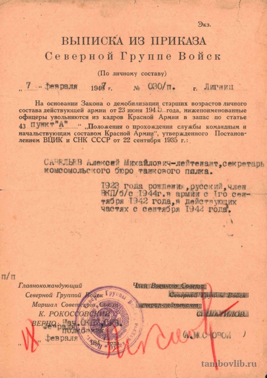 Выписка из приказа Северной Группе Войск Савельева Алексея Михайловича