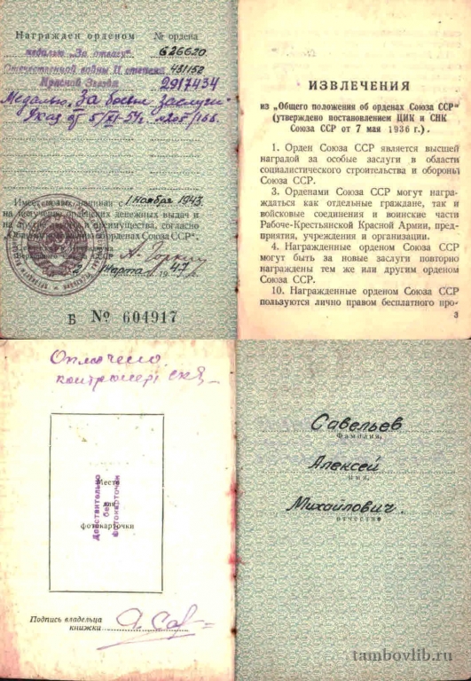 Орденская книжка Савельева Алексея Михайловича, лейтенанта
