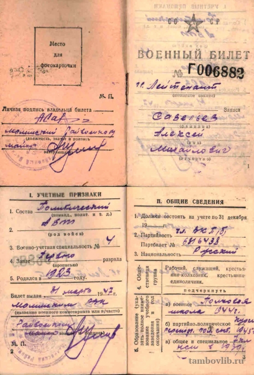 Военный билет офицерского состава запаса Савельева Алексея Михайловича, лейтенанта