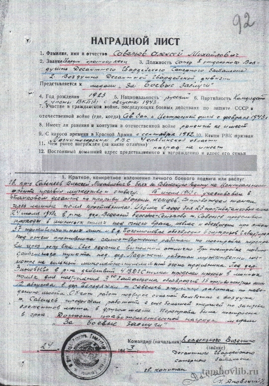 Наградной лист Савельева Алексея Михайловича, лейтенанта
