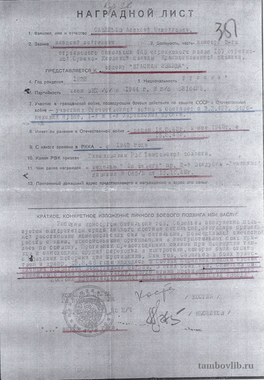 Наградной лист Савельева Алексея Михайловича, лейтенанта