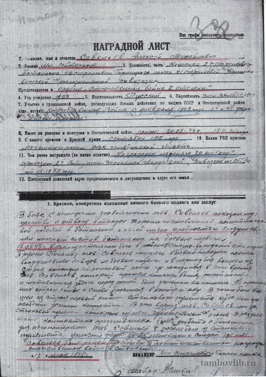 Наградной лист Савельева Алексея Михайловича, лейтенанта