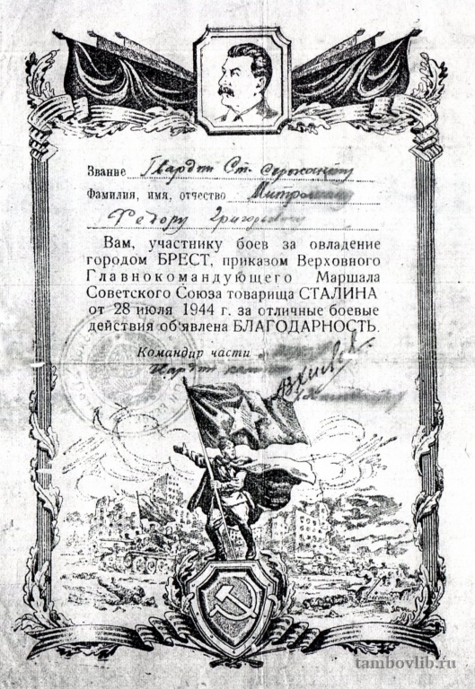 Благодарность за овладение городом Брест28 июля 1944 Межпоселенческая центральная библиотека Моршанского района Документ