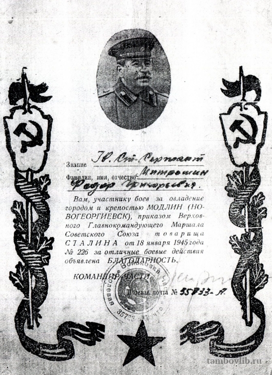 Благодарность за овладение городом и крепостью Модлин (Новогеоргиевск)18 января 1945 Межпоселенческая центральная библиотека Моршанского района Документ