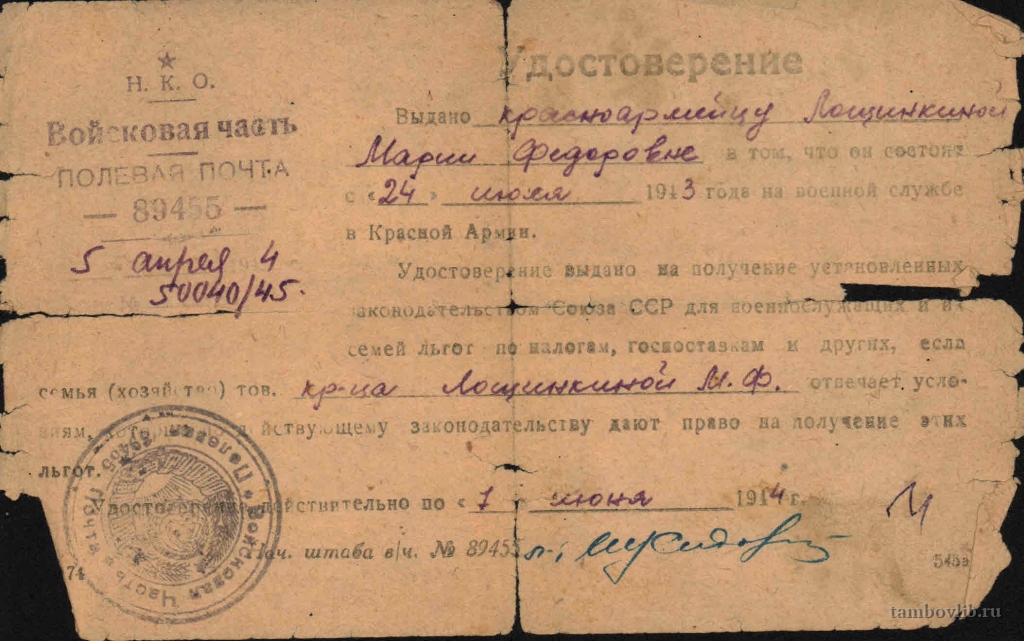 Родилась в июле 1923 г. в д. Марьевка Большеталинский сельсовет Тамбовкой области. До войны работала портнихой в г. Тамбове. Была призвана в августе 1943 г. Тамбовским РВК. Служила в звании рядового в должности шофера-прожектористом во Втором Авиационном Полку с 1944 по 1945 гг. Участвовала в подготовке ночных экипажей бомбардировщиков для защиты Москвы. После окончания войны была награждена медалью «За Победу над Германией», а так же юбилейными медалями. После войны работала на Арженском суконном комбинате. Умерла в июне 2009 г.