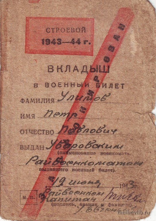 Вкладыш в военный билет с отметкой о брони Улимова Петра Павловича