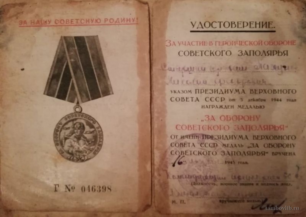 Удостоверение За участие в героической обороне Советского Заполярья Пахунова Николая Федотовича.